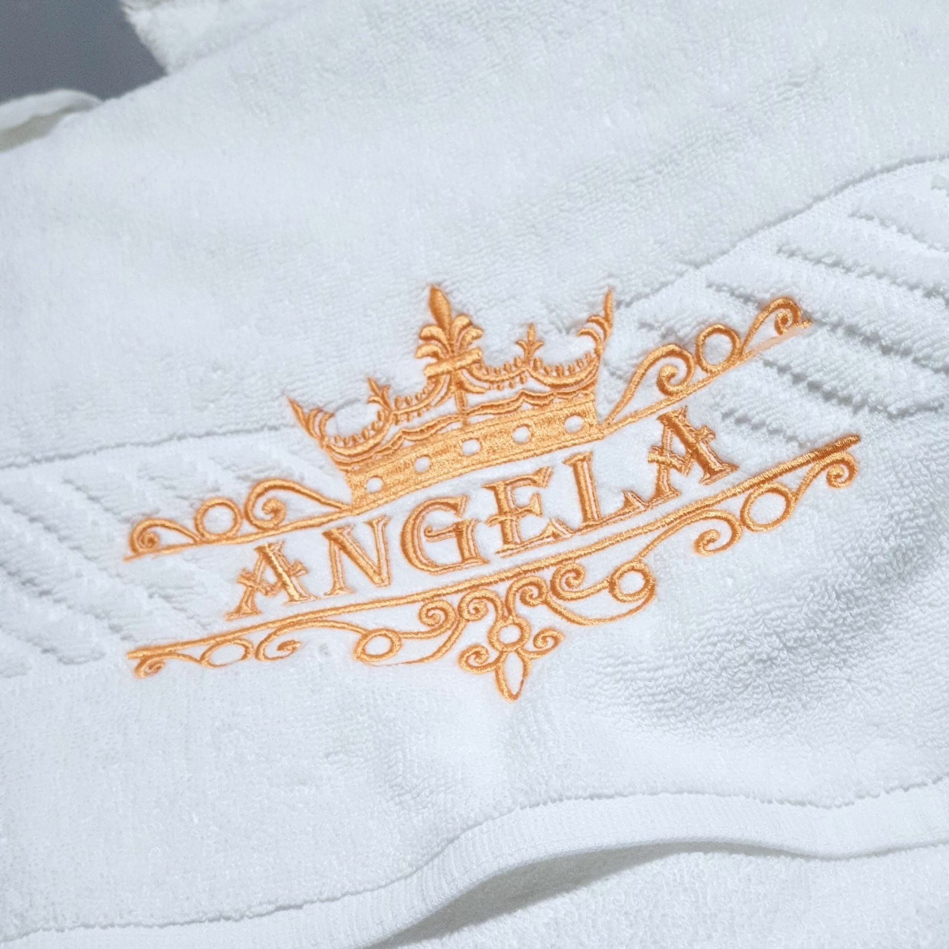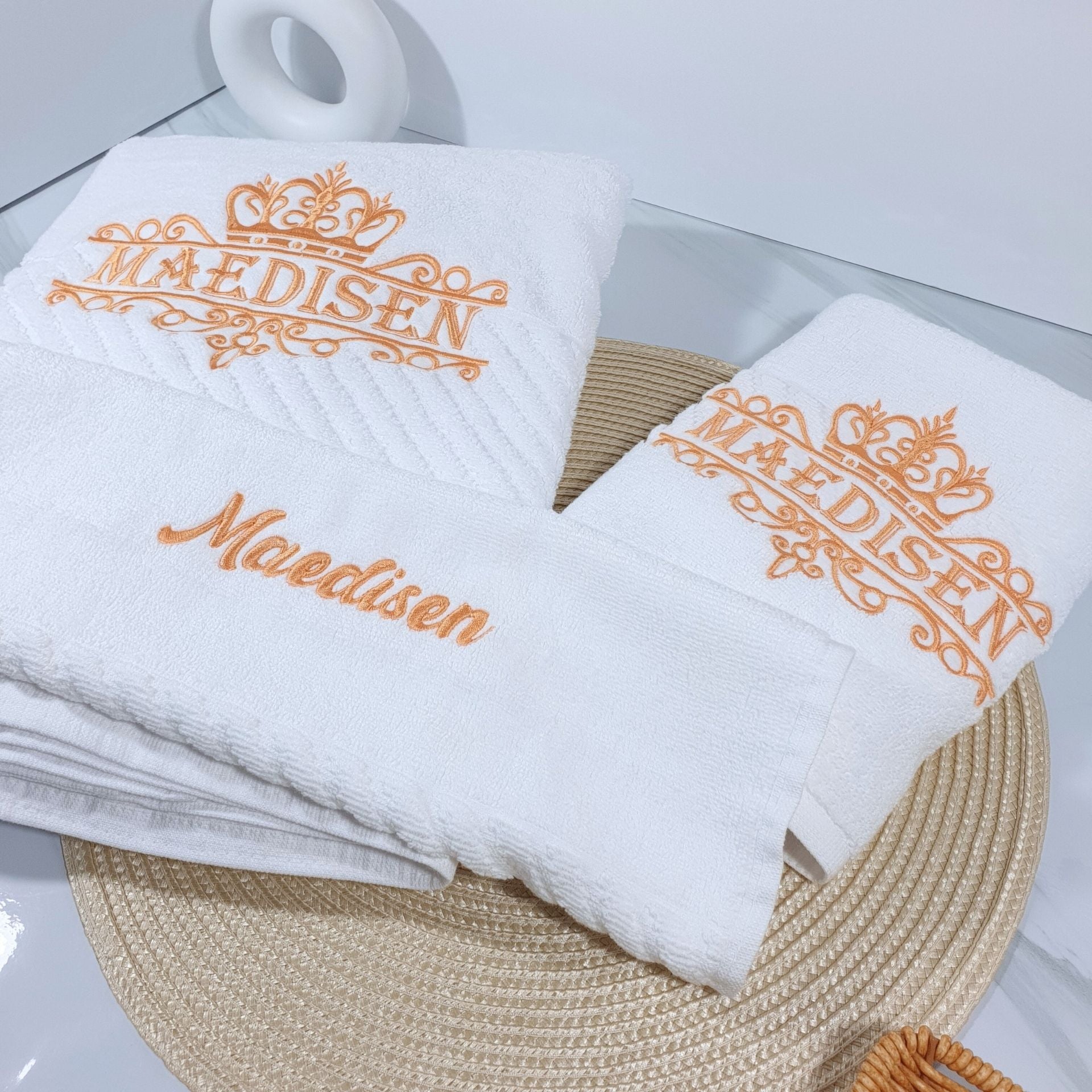 This personalised towel adds a special touch to your everyday essentials. Featuring a soft and luxurious white hand and bath towel, each piece is customized with your chosen name in an elegant font with crown design. Perfect for personalised gifts, wedding gift, home decor, or a personal treat.